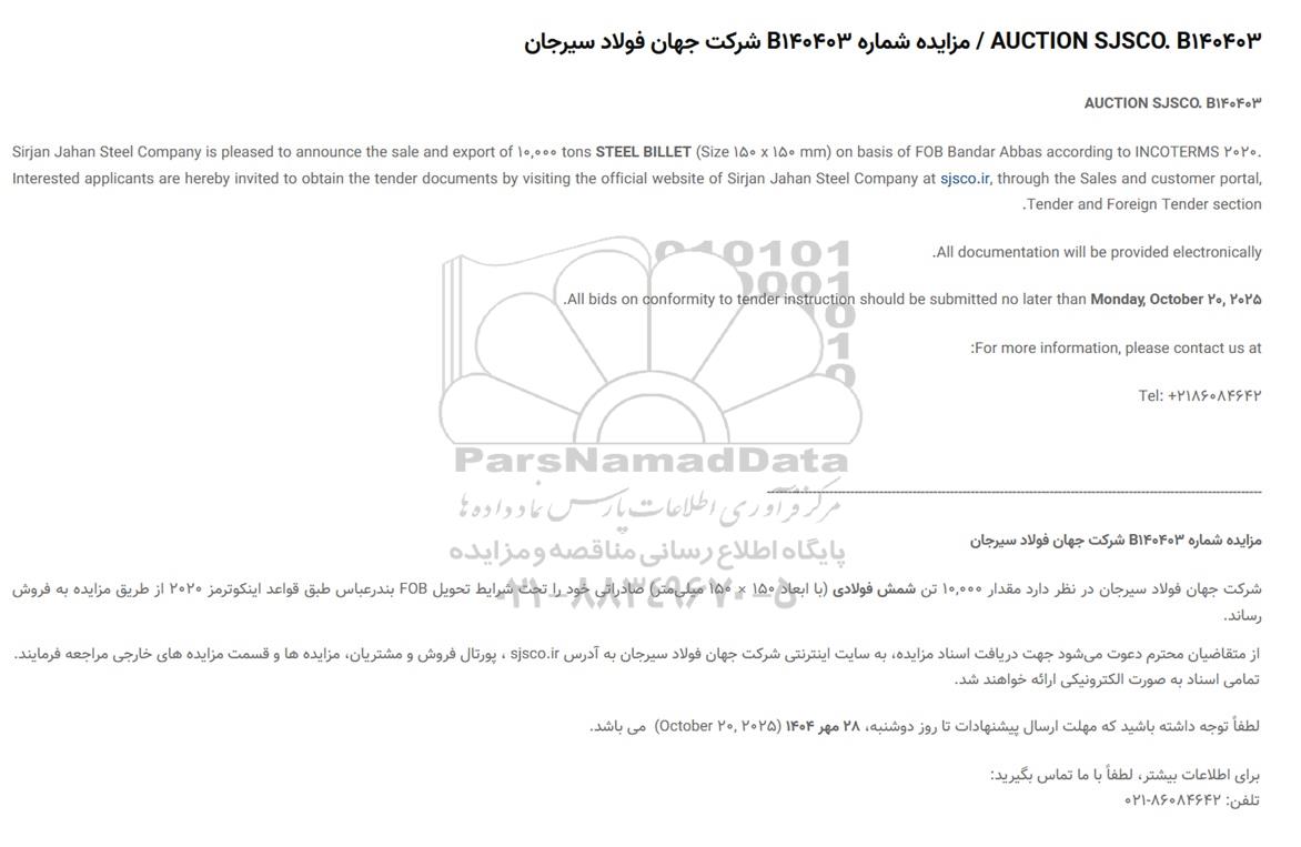 AUCTION SJSCO. B140403 / مزایده شماره B140403 شرکت جهان فولاد سیرجان