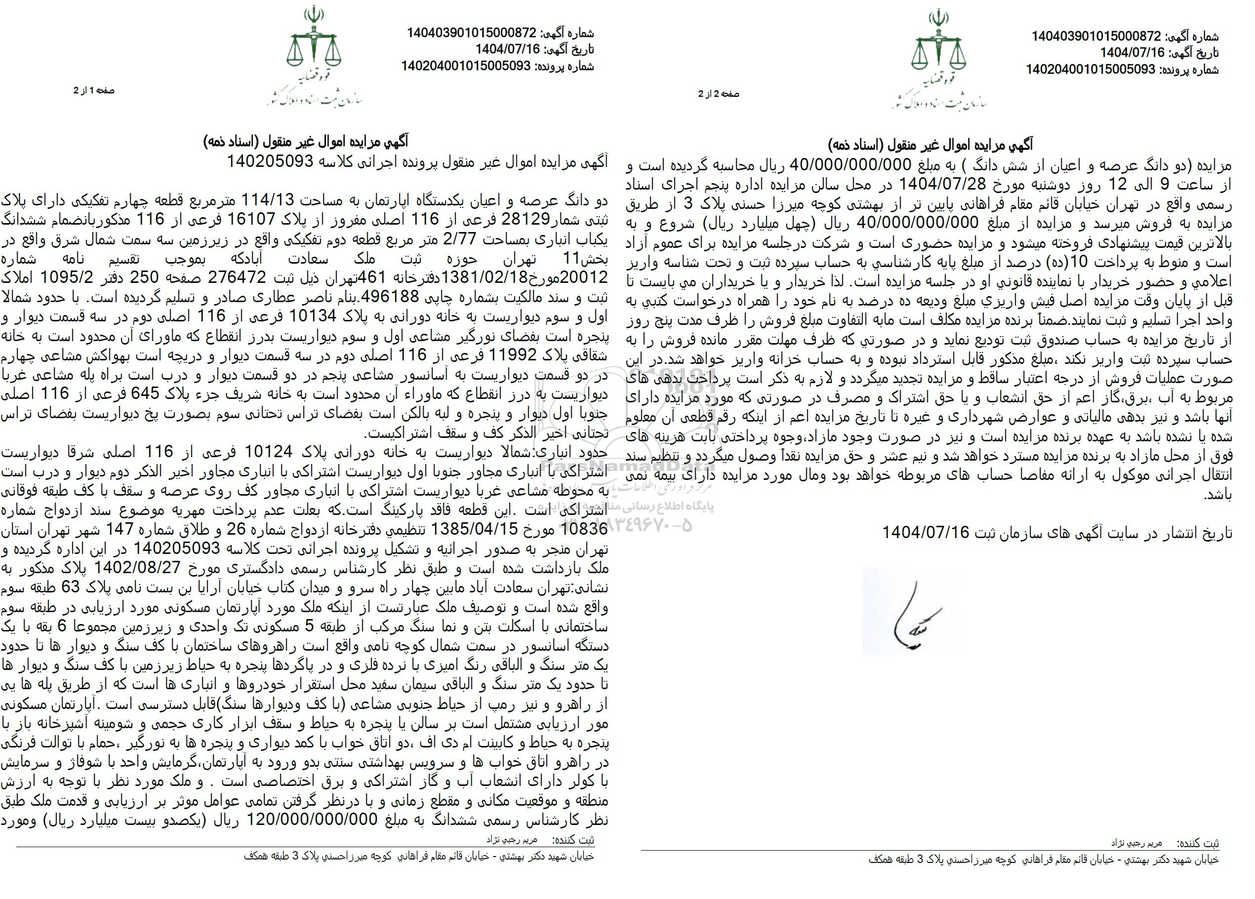 حدود انباری شمالا دیواریست به خانه دورانی پلاک 10124 فرعی از 116 اصلی شرقا دیواریست اشتراکی با انباری مجاور جنوبا اول دیواریست اشتراکی با انباری مجاور اخبر الذكر دوم دیوار و درب است. به محوطه مشاعی غربا دیواریست اشتراکی با انباری مجاور کف روی عرصه و سقف با کف طبقه فوقانی اشتراکی است. این قطعه فاقد پارکینگ است که بعلت عدم پرداخت مهریه موضوع سند ازدواج شماره 10836 مورخ 1385.04.15 تنظیمی دفترخانه ازدواج شماره 26 و طلاق شماره 147 شهر تهران استان تهران منجر به صدور اجرائیه و تشکیل پرونده اجرائی تحت کلاسه 140205093 در این اداره گردیده و ملک بازداشت شده است و طبق نظر کارشناس رسمی دادگستری مورخ 1402.08.27 پلاک مذکور به نشانی تهران سعادت آباد مابین چهار راه سرو و میدان کتاب خیابان آرایا بن بست نامی پلاک 63 طبقه سوم واقع شده است و توصیف ملک عبارتست از اینکه ملک مورد آپارتمان مسکونی مورد ارزیابی در طبقه سوم ساختمانی با اسکلت بتن و نما سنگ مرکب از طبقه 5 مسکونی تک واحدی و زیرزمین مجموعا 6 بقه با یک دستگه اسانسور در سمت شمال کوچه نامی واقع است راهروهای ساختمان با کف سنگ و دیوار ها تا حدود یک متر سنگ و الباقی رنگ امیزی با نرده فلزی و در پاگردها پنجره به حیاط زیرزمین با کف سنگ و دیوارها تا حدود یک متر سنگ و الباقی سیمان سفید محل استقرار خودروها و انباری ها است که از طریق پله ها یی از راهرو و نیز رمپ از حیاط جنوبی مشاعی با کف و دیوارها سنگ قابل دسترسی است . آپارتمان مسکونی مور ارزیابی مشتمل است بر سالن با پنجره به حیاط و سقف ابزار کاری حجمی و شومینه آشپرخانه باز با پنجره به حیاط و کابینت ام دی اف دو اتاق خواب با کمد دیواری و پنجره ها به نورگیر ، حمام با توالت فرنگی در راهرو اتاق خواب ها و سرویس بهداشتی سنتی بدو ورود به آپارتمان گرمایش واحد با شوفاژ و سرمایش با کولر دارای انشعاب آب و گاز اشتراکی و برق اختصاصی است. و ملک مورد نظر با توجه به ارزش منطقه و موقعیت مکانی و مقطع زمانی و با در نظر گرفتن تمامی عوامل موثر بر ارزیابی و قدمت ملک طبق نظر کارشناس رسمی ششدانگ به مبلغ 120.000.000.000 ریال یکصد و بیست میلیارد ریال و مورد مزایده دو دانگ عرصه و اعیان از شش دانگ ( به مبلغ 40.000.000.000 ریال محاسبه گردیده است و از ساعت 9 الی 12 روز دوشنبه مورخ 1404.07.28 در محل سالن مزایده اداره پنجم اجرای اسناد رسمی واقع در تهران خیابان قائم مقام فراهانی پایین تر از بهشتی کوچه میرزا حسنی پلاک 3 از طریق مزایده به فروش میرسد و مزایده از مبلغ 40.000.000.000 ريال چهل میلیارد ریال شروع و به بالاترین قیمت پیشنهادی فروخته میشود و مزایده حضوری است و شرکت در جلسه مزایده برای عموم آزاد باشد. است و منوط به پرداخت (10 (ده) درصد از مبلغ پایه کارشناسی به حساب سپرده ثبت و تحت شناسه واریز اعلامي و حضور خریدار با نماینده قانونی او در جلسه مزایده است. لذا خریدار و یا خریداران می بایست تا قبل از پایان وقت مزایده اصل فیش واريزي مبلغ ودیعه ده درصد به نام خود را همراه درخواست کتبی به واحد اجرا تسلیم و ثبت نمایند. ضمناً برنده مزایده مکلف است ما به التفاوت مبلغ فروش را ظرف مدت پنج روز از تاریخ مزایده به حساب صندوق ثبت تودیع نماید و در صورتی که ظرف مهلت مقرر مانده فروش را به حساب سپرده ثبت واریز نکند مبلغ مذکور قابل استرداد نبوده و به حساب خزانه واریز خواهد شد. در این صورت عملیات فروش از درجه اعتبار ساقط و مزایده تجدید میگردد و لازم به ذکر است پرداخت بدهی های مربوط به آب برق گار اعم از حق انشعاب و یا حق اشتراک و مصرف در صورتی که مورد مزایده دارای آنها باشد و نیز بدهی مالیاتی و عوارض شهرداری و غیره تا تاریخ مزایده اعم از اینکه رقم قطعی آن معلوم شده یا نشده باشد به عهده برنده مزایده است و نیز در صورت وجود مازاد وجوه پرداختی بابت هزینه های فوق از محل مازاد به برنده مزایده مسترد خواهد شد و نیم عشر و حق مزایده نقداً وصول میگردد و تنظیم سند انتقال اجرائی موکول به ارائه مفاصا حساب های مربوطه خواهد بود و مال مورد مزا