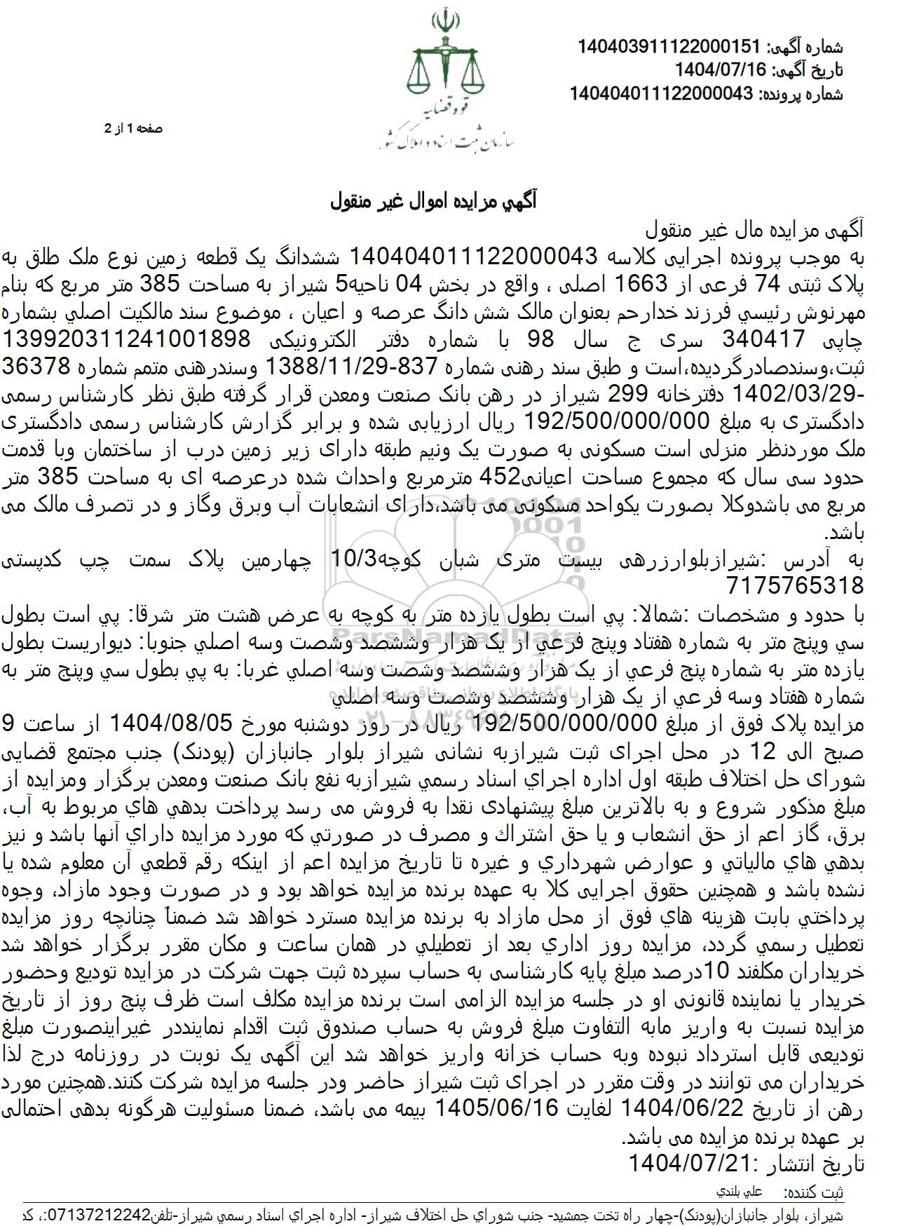 با حدود و مشخصات شمالا پی است بطول یازده متر به کوچه به عرض هشت متر شرقا پي است بطول سي و پنج متر به شماره هفتاد و پنج فرعی از یک هزار و ششصد و شصت و سه اصلي جنوبا دیواریست بطول یازده متر به شماره پنج فرعی از یک هزار و ششصد و شصت و سه اصلي غربا به پي بطول سي و پنج متر به شماره هفتاد و سه فرعی از یک هزار و ششصد و شصت و سه اصلي مزایده پلاک فوق از مبلغ 192.500.000.000 ریال در روز دوشنبه مورخ 1404.08.05 از ساعت 9 صبح الی 12 در محل اجرای ثبت شیراز به نشانی شیراز بلوار جانبازان (پودنک) جنب مجتمع قضایی شورای حل اختلاف طبقه اول اداره اجرای اسناد رسمي شيراز به نفع بانک صنعت و معدن برگزار و مزایده از مبلغ مذکور شروع و به بالاترین مبلغ پیشنهادی نقدا به فروش میرسد پرداخت بدهي هاي مربوط به آب برق گاز اعم از حق انشعاب و یا حق اشتراك و مصرف در صورتي که مورد مزایده دارای آنها باشد و نیز بدهي هاي مالياتي و عوارض شهرداری و غیره تا تاریخ مزایده اعم از اینکه رقم قطعی آن معلوم شده یا نشده باشد و همچنین حقوق اجرایی کلا به عهده برنده مزایده خواهد بود و در صورت وجود مازاد وجوه پرداختی بابت هزینه های فوق از محل مازاد به برنده مزایده مسترد خواهد شد ضمنا چنانچه روز مزایده تعطیل رسمي گردد مزایده روز اداری بعد از تعطیلی در همان ساعت و مکان مقرر برگزار خواهد شد خریداران مکلفند 10 درصد مبلغ پایه کارشناسی به حساب سپرده ثبت جهت شرکت در مزایده تودیع و حضور خریدار یا نماینده قانونی او در جلسه مزایده الزامی است برنده مزایده مکلف است ظرف پنج روز از تاریخ مزایده نسبت به واریز مابه التفاوت مبلغ فروش به حساب صندوق ثبت اقدام نمایند در غیر اینصورت مبلغ تودیعی قابل استرداد نبوده و به حساب خزانه واریز خواهد شد این آگهی یک نوبت در روزنامه درج لذا خریداران میتوانند در وقت مقرر در اجرای ثبت شیراز حاضر و در جلسه مزایده شرکت کنند. همچنین مورد رهن از تاریخ 1404/06/22 لغایت 1405/06/16 بیمه می باشد ضمنا مسئولیت هرگونه بدهی احتمالی بر عهده برنده مزایده می باشد.