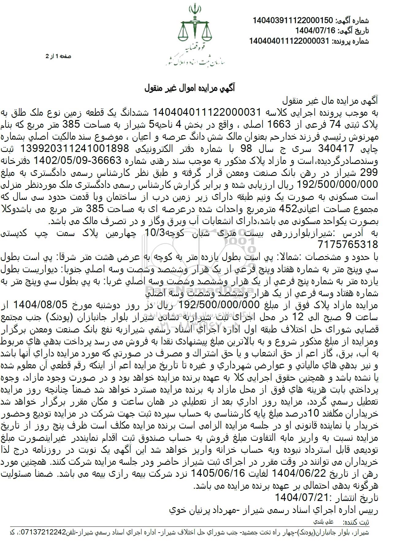مزایده مازاد پلاک فوق از مبلغ 192.500.000.000 ریال در روز دوشنبه مورخ 1404.08.05 از ساعت 9 صبح الی 12 در محل اجرای ثبت شیراز به نشانی شیراز بلوار جانبازان پودنک) جنب مجتمع قضایی شورای حل اختلاف طبقه اول اداره اجرای اسناد رسمی شیراز به نفع بانک صنعت و معدن برگزار و مزایده از مبلغ مذکور شروع و به بالاترین مبلغ پیشنهادی نقدا به فروش میرسد پرداخت بدهی های مربوط به آب برق گاز اعم از حق انشعاب و یا حق اشتراك و مصرف در صورتی که مورد مزایده دارای آنها باشد و نیز بدهی های مالیاتی و عوارض شهرداری و غیره تا تاریخ مزایده اعم از اینکه رقم قطعی آن معلوم شده یا نشده باشد و همچنین حقوق اجرایی کلا به عهده برنده مزایده خواهد بود و در صورت وجود مازاد وجوه پرداختی بابت هزینه های فوق از محل مازاد به برنده مزایده مسترد خواهد شد ضمنا چنانچه روز مزایده تعطیل رسمی گردد مزایده روز اداری بعد از تعطیلی در همان ساعت و مکان مقرر برگزار خواهد شد خریداران مکلفند 10 درصد مبلغ پایه کارشناسی به حساب سپرده ثبت جهت شرکت در مزایده تودیع و حضور خریدار یا نماینده قانونی او در جلسه مزایده الزامی است برنده مزایده مکلف است ظرف پنج روز از تاریخ مزایده نسبت به واریز مابه التفاوت مبلغ فروش به حساب صندوق ثبت اقدام نمایند در غیر اینصورت مبلغ تودیعی قابل استرداد نبوده و به حساب خزانه واریز خواهد شد این آگهی یک نوبت در روزنامه درج لذا خریداران میتوانند در وقت مقرر در اجرای ثبت شیراز حاضر و در جلسه مزایده شرکت کنند. همچنین مورد رهن از تاریخ 1404.06.22 لغایت 1405.06.16 نزد شرکت بیمه رازی بیمه می باشد. ضمنا مسئولیت