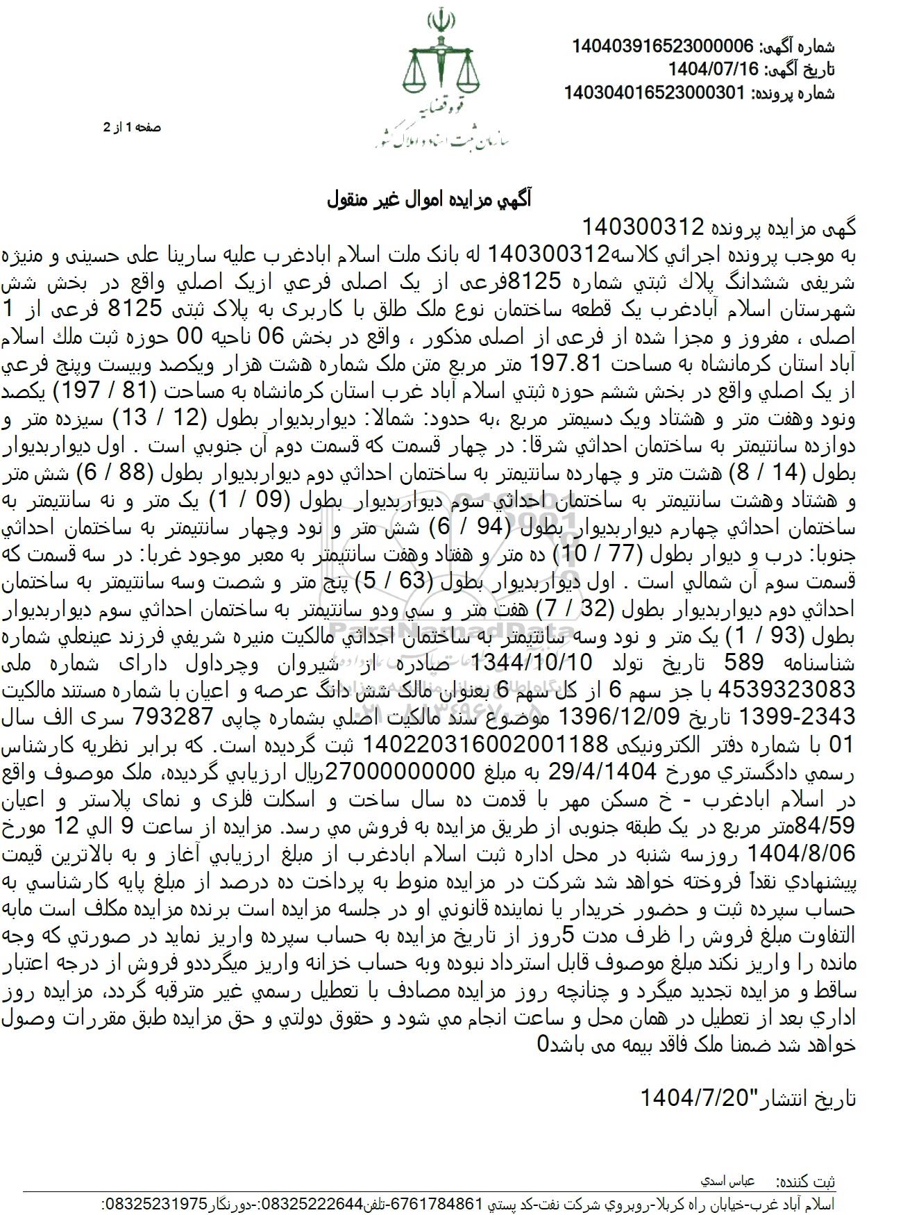 اگهی مزایده پرونده 140300312 به موجب پرونده اجرائی کلاسه 140300312 له بانک ملت اسلام اباد غرب عليه سارينا على حسینی و منیژه شریفی ششدانگ پلاك ثبتي شماره 8125 فرعی از یک اصلی فرعی از یک اصلی واقع در بخش شش شهرستان اسلام آباد غرب یک قطعه ساختمان نوع ملک طلق با کاربری به پلاک ثبتی 8125 فرعی از 1 اصلی ، مفروز و مجزا شده از فرعی از اصلی مذکور ، واقع در بخش 06 ناحیه 00 حوزه ثبت ملك اسلام آباد استان کرمانشاه به مساحت 197.81 متر مربع متن ملک شماره هشت هزار و یکصد و بیست و پنج فرعي از یک اصلی واقع در بخش ششم حوزه ثبتي اسلام آباد غرب استان کرمانشاه به مساحت (81 / 197) يكصد و نود و هفت متر و هشتاد و یک دسیمتر مربع به حدود شمالا دیوار بديوار بطول (12) / (13) سیزده متر و دوازده سانتیمتر به ساختمان احداثی شرقا در چهار قسمت که قسمت دوم آن جنوبی است . اول دیوار بدیوار بطول (14) / (8) هشت متر و چهارده سانتیمتر به ساختمان احداثی دوم ديوار بديوار بطول (88 / 6) شش متر و هشتاد و هشت سانتیمتر به ساختمان احداثي سوم ديوار بديوار بطول (09 / (1) یک متر و نه سانتیمتر به ساختمان احداثی چهارم دیوار بدیوار بطول (94) / (6) شش متر و نود و چهار سانتیمتر به ساختمان احداثي جنوبا درب و دیوار بطول (77) / (10) ده متر و هفتاد و هفت سانتیمتر به معبر موجود غربا در سه قسمت که قسمت سوم آن شمالی است. اول دیوار بدیوار بطول (63) / (5) پنج متر و شصت و سه سانتیمتر به ساختمان احداثي دوم ديوار بديوار بطول (32) / (7) هفت متر و سي و دو سانتیمتر به ساختمان احداثي سوم ديوار بديوار بطول (93) / (1) یک متر و نود و سه سانتیمتر به ساختمان احداثي مالكيت منيره شريفي فرزند عينعلي شماره شناسنامه 589 تاریخ تولد 1344/10/10 صادره از شیروان و چرداول دارای شماره ملی 4539323083 با جز سهم 6 از کل سهم 6 بعنوان مالک شش دانگ عرصه و اعیان با شماره مستند مالکیت 1399-2343 تاريخ 1396.12.09 موضوع سند مالكيت اصلي بشماره چاپی 793287 سری الف سال 01 با شماره دفتر الکترونیکی 140220316002001188 ثبت گردیده است که برابر نظریه کارشناس رسمی دادگستري مورخ 29.4.1404 به مبلغ 27000000000 ریال ارزیابی گردیده ملک موصوف واقع در اسلام آباد غرب - خ مسکن مهر با قدمت ده سال ساخت و اسکلت فلزی و نمای پلاستر و اعیان 84/59 متر مربع در یک طبقه جنوبی از طریق مزایده به فروش می رسد. مزایده از ساعت 9 الي 12 مورخ 1404.8.06 روزسه شنبه در محل اداره ثبت اسلام آباد غرب از مبلغ ارزیابی آغاز و به بالاترین قیمت پیشنهادی نقدا فروخته خواهد شد شرکت در مزایده منوط به پرداخت ده درصد از مبلغ پایه کارشناسی به حساب سپرده ثبت و حضور خریدار یا نماینده قانونی او در جلسه مزایده است برنده مزایده مکلف است ما به التفاوت مبلغ فروش را ظرف مدت 5 روز از تاریخ مزایده به حساب سپرده واریز نماید در صورتی که وجه مانده را واریز نکند مبلغ موصوف قابل استرداد نبوده و به حساب خزانه واریز میگردد و فروش از درجه اعتبار ساقط و مزایده تجدید میگرد و چنانچه روز مزایده مصادف با تعطیل رسمي غير مترقبه گردد. مزایده روز اداري بعد از تعطیل در همان محل و ساعت انجام میشود و حقوق دولتي و حق مزایده طبق مقررات وصول خواهد شد ضمنا ملک فاقد بیمه می باشد.