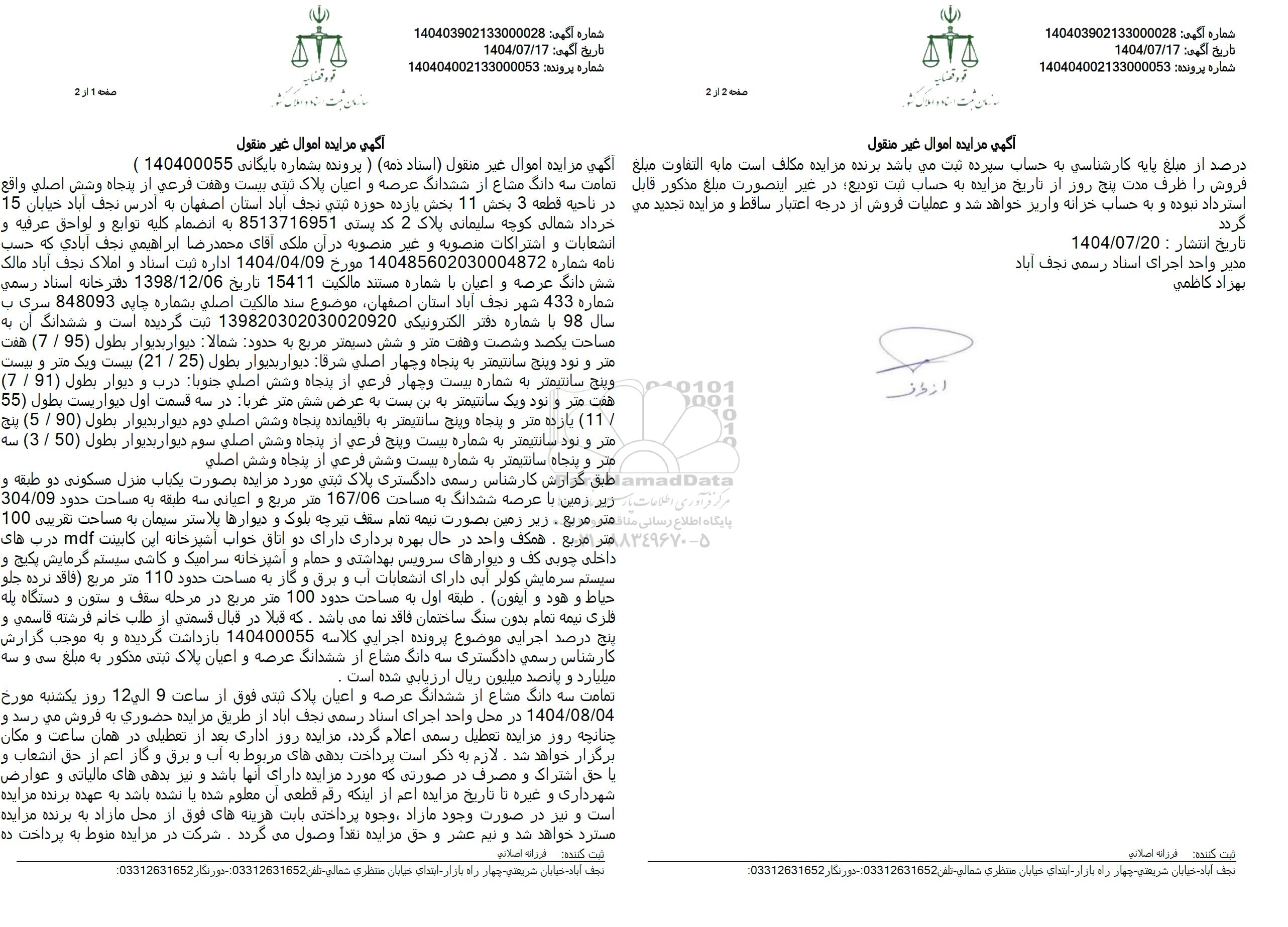 آگهی مزایده اموال غير منقول (اسناد ذمه) ( پرونده بشماره بایگانی 140400055 )