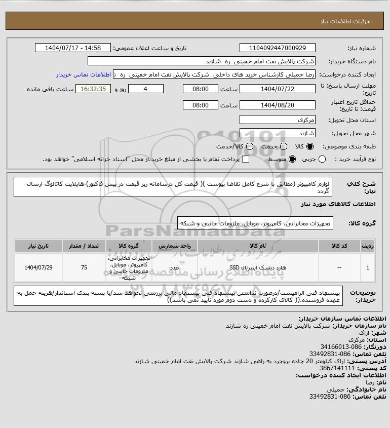 | 1 | -- | هارد دیسک اینترنال SSD | عدد | تجهیزات مخابراتی، کامپیوتر، موبایل، ملزومات جانبی و شبکه | 75 | 1404/07/29 |
