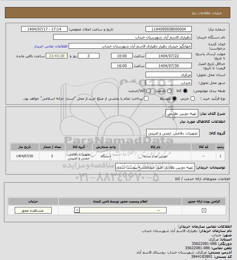 | 1 | -- | دوربین مدار بسته | دستگاه | تجهیزات دفاعی، ایمنی و امنیتی | 3 | 1404/07/30 |