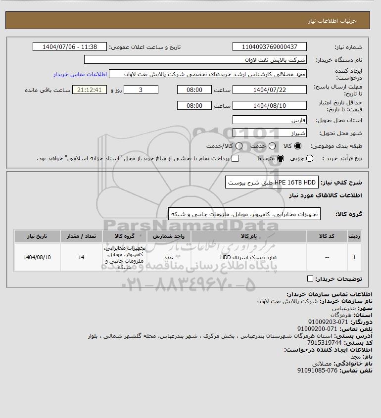 شرح کلی نیاز: HPE 16TB HDD طبق شرح پیوست