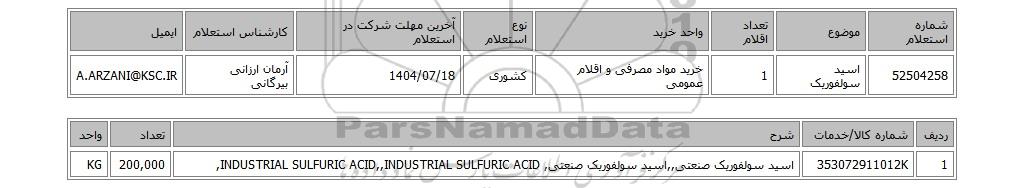 52504258 | اسید سولفوریک | 1 | خرید مواد مصرفی و اقلام عمومی | کشوری | 1404/07/18 | آرمان ارزانی بیرگانی | A.ARZANI@KSC.IR |