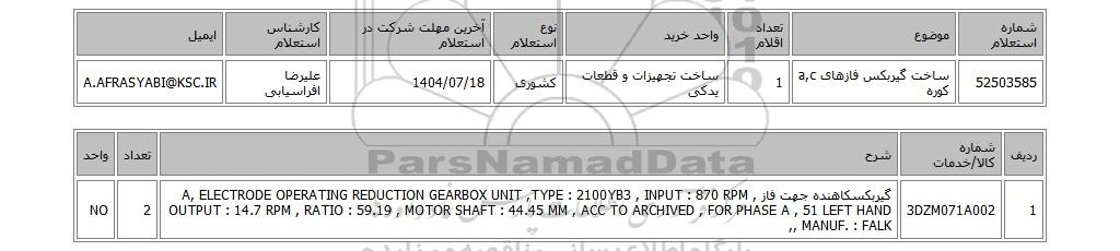 استعلام ساخت گیربکس فازهای ac کوره, استعلام ساخت گیربکس فازهای a,c کوره