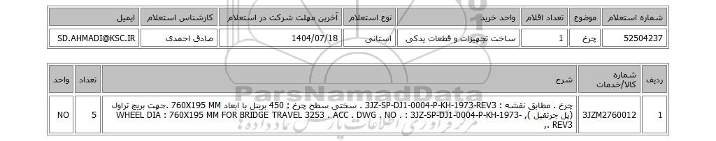 52504237 | چرخ | 1 | ساخت تجهیزات و قطعات یدکی | استانی | 1404/07/18 | صادق احمدی | SD.AHMADI@KSC.IR |