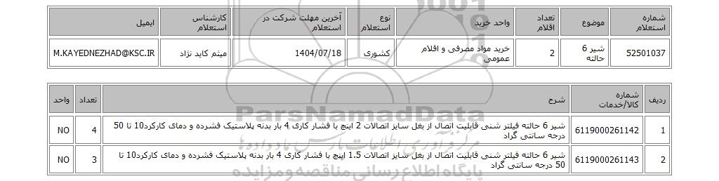 52501037 | شیر 6 حالته | 2 | خرید مواد مصرفی و اقلام عمومی | کشوری | 1404/07/18 | میثم کاید نژاد | M.KAYEDNEZHAD@KSC.IR |