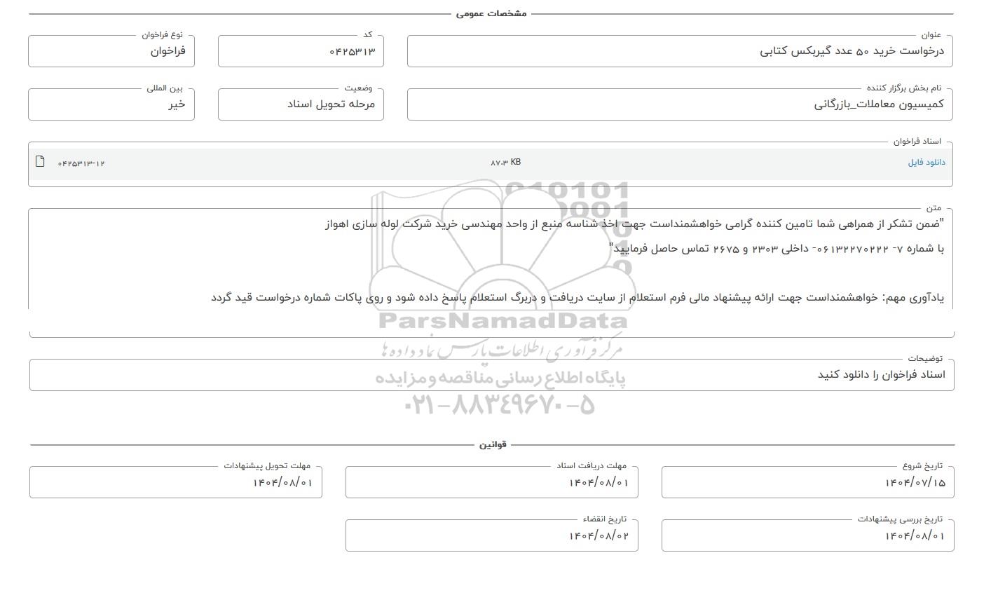 تاریخ بررسی پیشنهادات: 1404.08.01 - تاریخ انقضاء: 1404.08.02