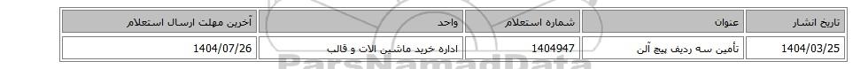 | 1404/03/25 | تأمین سه ردیف پیچ آلن | 1404947 | اداره خرید ماشین الات و قالب | 1404/07/26 |
