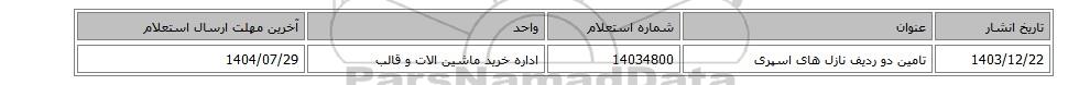 1403/12/22تامین دو ردیف نازل های اسپری14034800اداره خرید ماشین الات و قالب1404/07/29
