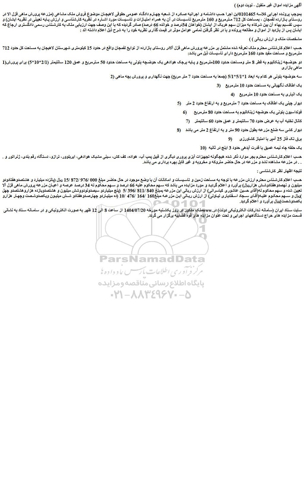 حسب اعلام کارشناس محترم ارزش مزرعه با توجه به مساحت زمین و تاسیسات و امکانات آن با وضع موجود در حال حاضر مبلغ 000 /976 /872 /15 ریال (پانزده میلیارد و هشتصدوهفتادودو میلیون و نهصدوهفتادوشش هزارریال) برآورد و اعلام گردید و مورد مزایده می باشد که سهم محکوم علیه 66 درصد و سهم محکوم له 34 درصد عرصه و اعیان مزرعه پرورش ماهی قزل آلا تعیین شده و سهم محکوم له(آقای حسین عاشوری کیاسرائی) از ارزش ریالی این مزرعه بمبلغ 840 /811 /396 /5  (پنج میلیاردو سیصدونودووشش میلیون و هشتصدویازده هزاروهشتصدو چهل )ریال و سهم محکوم علیه(آقای سجاد اسفندیاری لیاولی) از ارزش ریالی این مزرعه مبلغ160 /164 /476 /10 (ده میلیاردو چهارصدوهفتادو شش میلیون ویکصدوشصت وچهار هزارو یکصدوشصت)ریال برآورد و اعلام گردید.