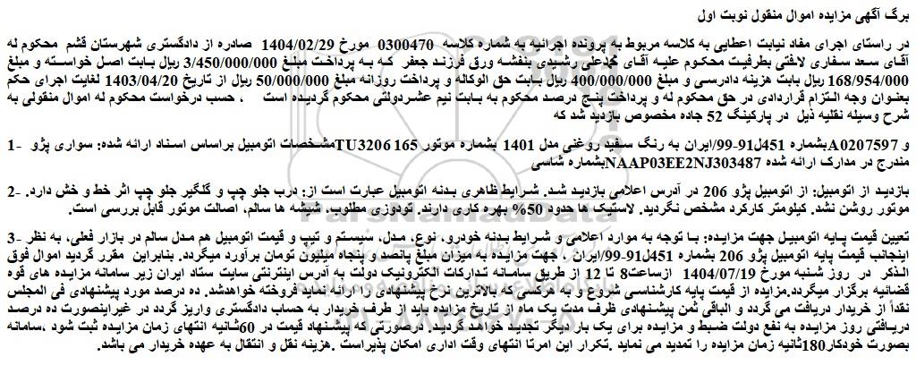 در راستای اجرای مفاد نیابت اعطایی به کلاسه مربوط به پرونده اجرائیه به شماره کلاسه  0300470  مورخ 1404/02/29  صادره از دادگستری شهرستان قشم  محکوم له آقای سعد سفاری لافتی بطرفیت محکوم علیه آقای محمدعلی رشیدی بنفشه ورق فرزند جعفر  که به پرداخت مبلغ 3/450/000/000 ریال بابت اصل خواسته و مبلغ 168/954/000 ریال بابت هزینه دادرسی و مبلغ 400/000/000 ریال بابت حق الوکاله و پرداخت روزانه مبلغ 50/000/000 ریال از تاریخ 1403/04/20 لغایت اجرای حکم بعنوان وجه التزام قراردادی در حق محکوم له و پرداخت پنج درصد محکوم به بابت نیم عشردولتی محکوم گردیده است    ، حسب درخواست محکوم له اموال منقولی به شرح وسیله نقلیه ذیل  در پارکینگ 52 جاده مخصوص بازدید شد که