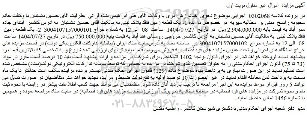در پرونده کلاسه 0302068 اجرایی موضوع دعوی خانم زهرا دری با وکالت آقای علی ابراهیمی بنده قرائی بطرفیت آقای حسین دشتبان با وکالت خانم محبوبه راسخ مبنی بر مطالبه مهریه در خصوص مزایده 1- یک قطعه زمین فاقد پلاک ثبتی به مالکیت آقای حسین دشتبان به آدرس کاشمر ابتدای جاده ممر آباد به قیمت پایه 2.904.000.000 ریال در تاریخ 1404/07/27 ساعت 08 الی 12 به شماره حراج 3004107157000101 2- یک قطعه زمین فاقد پلاک ثبتی به مالکیت آقای حسین دشتبان به آدرس کاشمر خروجی روستای هند آباد به قیمت پایه 750.000.000 ریال در تاریخ 1404/07/27 ساعت 08 الی 12 به شماره حراج 3004107157000102 در سامانه ستاد به آدرسسایت ستاد ایران (سامانه تدارکات الکترونیکی دولت) در قسمت مزایده های حراج دستگاه های اجرائی و تحت عنوان مزایده های قوه قضائیه به فروش می رسد قیمت پایه از بهای ارزیابی شده شروع و به شخصی که بالاترین قیمت را پیشنهاد نماید فروخته خواهد شد. در اجرای قانون بودجه 1402 اشخاص برای شرکت در مزایده و ارائه پیشنهاد قیمت باید 10 درصد قیمت مقرر در مواد (73 تا 75) قانون اجرای احکام مدنی را به عنوان تضمین نقدی شرکت در مزایده به حسابی که توسط سامانه تدارکات الکترونیکی دولت(ستاد) مشخص شده است تسلیم نماید در این صورت نیازی به پرداخت بهاء موضوع ماده (129) قانون اجرای احکام مدنی نیست. برنده مزایده مکلف است حداکثر تا یک ماه نسبت به پرداخت ثمن معامله اقدام نماید در غیر اینصورت 10 درصد اولیه به نفع دولت ضبط و مزایده تجدید خواهد شد. متقاضیان در صورت تمایل می توانند 5 روز قبل از موعد مزایده به این اجرا مراجعه تا ترتیب بازدید آنان داده شود. متقاضیان می توانند جهت کسب اطلاعات بیشتر در رابطه با نحوه ثبت نام و نحوه شرکت در مزایده های قوه قضائیه در سامانه ستاد به سربرگ آموزش(مستندات مزایده های قوه قضائیه) در سایت ستاد مراجعه نموده و همچنین با شماره 1456 تماس حاصل نمایند.