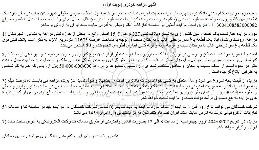 شعبه دوم اجرای احکام مدنی دادگستری شهرستان مراغه جهت اجرای نیابت صادره از شعبه اول دادگاه عمومی حقوقی شهرستان بناب در نظر دارد یک قطعه زمین کشاورزی بخواسته محکومیت مدنی (حکم به پرداخت وجه نقد) از بابت محکومیت در حق آقای خلیل نجفی را با مشخصات ذیل با شماره حراج 3004108583000082 را ازطریق انجام مزایده آنلاین در سامانه تدارکات الکترونیکی به آدرس سایت ستاد ایران به فروش برساند: