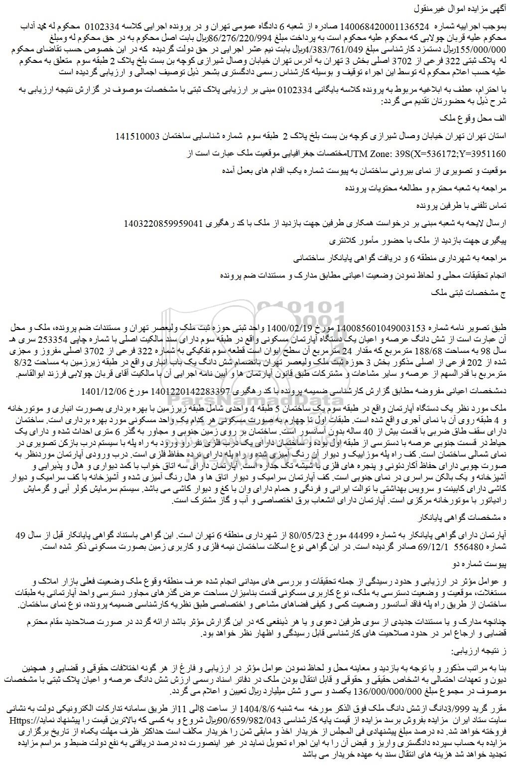 بموجب اجراییه شماره 140068420001136524 صادره از شعبه 6 دادگاه عمومی تهران و در پرونده اجرایی کلاسه 0102334 محکوم له محمد آداب محکوم علیه قربان چولابی که محکوم علیه محکوم است به پرداخت مبلغ 86/276/220/994ریال بابت اصل محکوم به در حق محکوم له ومبلغ 155/000/000ریال دستمزد کارشناسی مبلغ 4/383/761/049ریال بابت نیم عشر اجرایی در حق دولت گردیده که در این خصوص حسب تقاضای محکوم له پلاک ثبتی 322 فرعی از 3702 اصلی بخش 3 تهران به آدرس تهران خیابان وصال شیرازی کوچه بن بست بلخ پلاک 2 طبقه سوم متعلق به محکوم علیه حسب اعلام محکوم له توسط این اجراء توقیف و بوسیله کارشناس رسمی دادگستری بشحر ذیل توصیف اجمالی و ارزیابی گردیده است