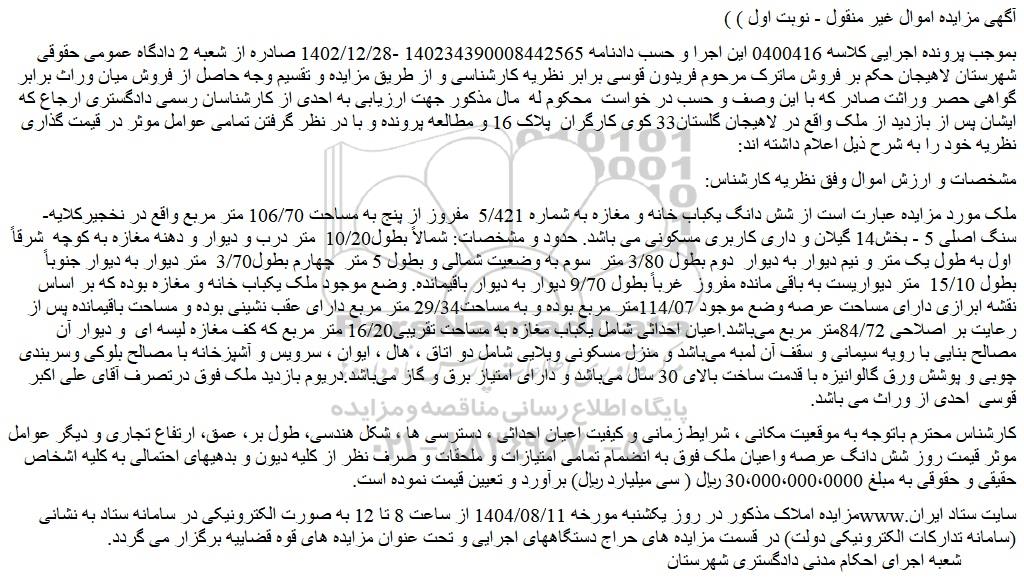 بموجب پرونده اجرایی کلاسه 0400416 این اجرا و حسب دادنامه 140234390008442565 -1402/12/28 صادره از شعبه 2 دادگاه عمومی حقوقی شهرستان لاهیجان حکم بر فروش ماترک مرحوم فریدون قوسی برابر نظریه کارشناسی و از طریق مزایده و تقسیم وجه حاصل از فروش میان وراث برابر گواهی حصر وراثت صادر که با این وصف و حسب در خواست محکوم له مال مذکور جهت ارزیابی به احدی از کارشناسان رسمی دادگستری ارجاع که ایشان پس از بازدید از ملک واقع در لاهیجان گلستان33 کوی کارگران پلاک 16 و مطالعه پرونده و با در نظر گرفتن تمامی عوامل موثر در قیمت گذاری نظریه خود را به شرح ذیل اعلام داشته اند: