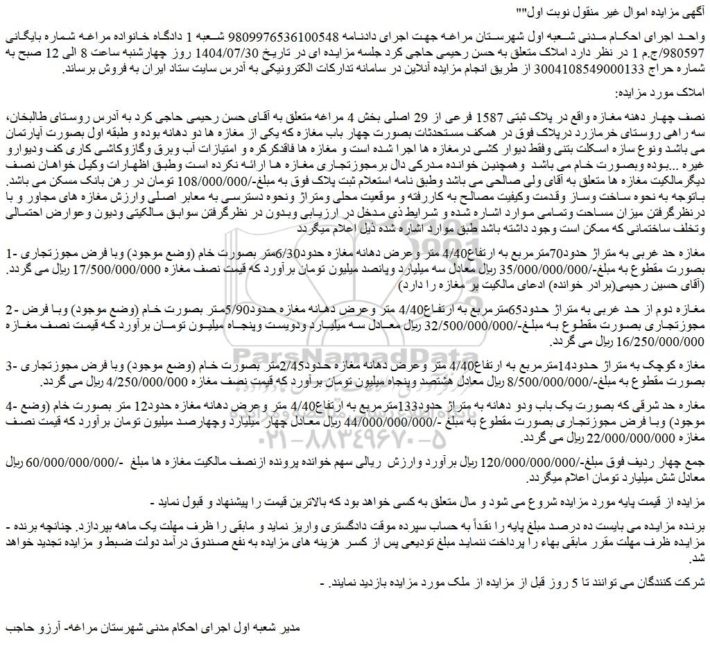 واحد اجرای احکام مدنی شعبه اول شهرستان مراغه جهت اجرای دادنامه 9809976536100548 شعبه 1 دادگاه خانواده مراغه شماره بایگانی 980597/ج.م 1 در نظر دارد املاک متعلق به حسن رحیمی حاجی کرد جلسه مزایده ای در تاریخ 1404/07/30 روز چهارشنبه ساعت 8 الی 12 صبح به شماره حراج 3004108549000133 از طریق انجام مزایده آنلاین در سامانه تدارکات الکترونیکی به آدرس سایت ستاد ایران به فروش برساند.