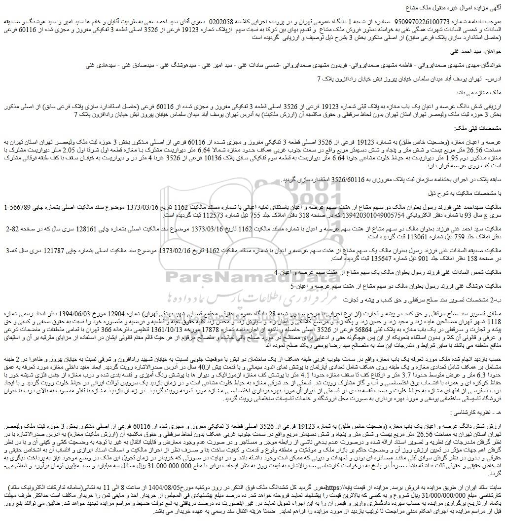 بموجب دادنامه شماره 9509970226100773 صادره از شعبه 1 دادگاه عمومی تهران و در پرونده اجرایی کلاسه 0202058 دعوی آقای سید احمد غنی به طرفیت آقایان و خانم ها سید امیر و سید هوشنگ و صدیقه السادات و شمسی السادات شهرت همگی غنی به خواسته دستور فروش ملک مشاع و تقسیم بهای بین شرکا به نسبت سهم ازپلاک شماره 19123 فرعی از 3526 اصلی قطعه 3 تفکیکی مفروز و مجزی شده از 60116 فرعی (حاصل استاندارد سازی پلاک فرعی سابق) از اصلی مذکور بخش 3 بشرح ذیل توصیف و ارزیابی گردیده است