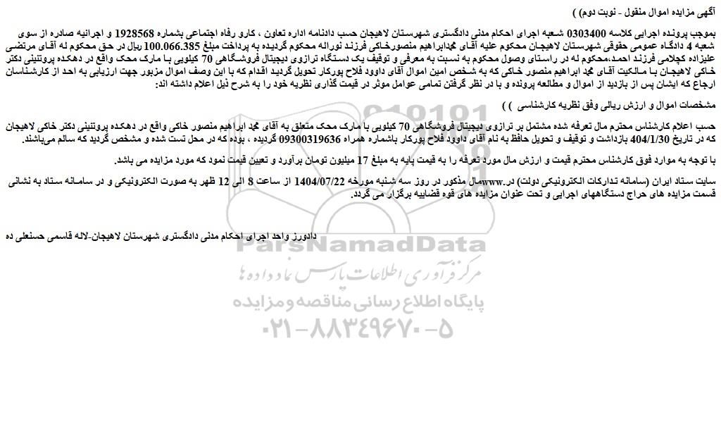 بموجب پرونده اجرایی کلاسه 0303400 شعبه اجرای احکام مدنی دادگستری شهرستان لاهیجان حسب دادنامه اداره تعاون ، کارو رفاه اجتماعی بشماره 1928568 و اجرائیه صادره از سوی شعبه 4 دادگاه عمومی حقوقی شهرستان لاهیجان محکوم علیه آقای محمدابراهیم منصورخاکی فرزند نوراله محکوم گردیده به پرداخت مبلغ 100.066.385 ریال در حق محکوم له آقای مرتضی علیزاده کچلامی فرزند احمد،محکوم له در راستای وصول محکوم به نسبت به معرفی و توقیف یک دستگاه ترازوی دیجیتال فروشگاهی 70 کیلویی با مارک محک واقع در دهکده پروتئینی دکتر خاکی لاهیجان با مالکیت آقای محمد ابراهیم منصور خاکی که به شخص امین اموال آقای داوود فلاح پورکار تحویل گردید اقدام که با این وصف اموال مزبور جهت ارزیابی به احد از کارشناسان ارجاع که ایشان پس از بازدید از اموال و مطالعه پرونده و با در نظر گرفتن تمامی عوامل موثر در قیمت گذاری نظریه خود را به شرح ذیل اعلام داشته اند: