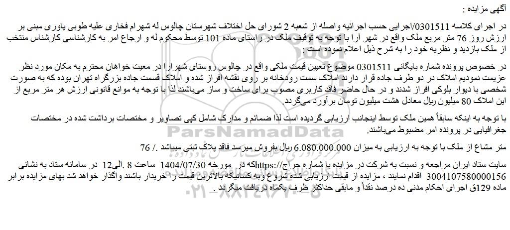 در اجرای کلاسه 0301511/اجرایی حسب اجرائیه واصله از شعبه 2 شورای حل اختلاف شهرستان چالوس له شهرام فخاری علیه طوبی یاوری مبنی بر ارزش روز 76 متر مربع ملک واقع در شهر آرا با توجه به توقیف ملک در راستای ماده 101 توسط محکوم له و ارجاع امر به کارشناسی کارشناس منتخب از ملک بازدید و نظریه خود را به شرح ذیل اعلام نموده است :
