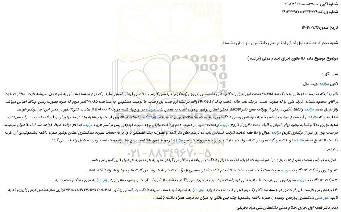 نظر به اینکه در پرونده اجرائی تحت کلاسه 0400258شعبه اول اجرای احکام مدنی دشتستان (برازجان)محکوم له رضوان کاوسی تقاضای فروش اموال توقیفی که نوع ومشخصات آن به شرح ذیل میباشد بابت مطالبات خود از آقای محمود افسانه فرزند علی را که عبارت است از یک باب خانه تحت پلاک 7402/287واقع در تنگ ارم جنب پل وحدت با نوعیت مسکونی به مساحت 330/85متر مربع که صرفا بصورت زمین وفاقد اعیانی میباشد رااز طریق انجام مزایده وانتشار آگهی در یکی از روزنامه های کثیر الانتشار محلی استان بوشهر رانموده است به همین علت مزایده در روزچهار شنبه مورخه1404/8/14 از ساعت 8الی12ظهر در محل این اجرا برگذار خواهد شدقیمتی که مزایده از آن شروع میشودبراساس نظریه کارشناس رسمی دادگستری مبلغ 7/300/000/000ریال بوده وبرنده مزایده کسی است که بالاترین قیمت را پیشنهادوده درصد بهای آن را فی المجلس به عنوان سپرده به شعبه اجرای احکام تسلیم وبقیه بهای اموال را ظرف مدت 30روز از تاریخ مزایده پرداخت نماید در صورت عدم پرداخت مابقی وجه سپرده تودیعی پس از کسر هزینه مزایده به نفع دولت ضبط خواهد شد لذامتقاضیان میتوانند در مدت پنج روز قبل از برگذاری تاریخ مزایده اموال را ملاحظه نمایند شرکت کنندگان باید ده درصد مبلغ ذکر شده را بصورت چک تضمینی یا واریز به حساب سپرده دادگستری استان بوشهر همراه داشته باشندوالباقی آن ظرف یک ماه از تاریخ انجام مزایده دریافت می گرددودر صورت انصراف خریدار از خریدویا عدم پرداخت ثمن مزایده در موعد مقرر 10% اولیه بنفع صندوق دولت ضبط ومزایده باطل وتجدید می گردد.