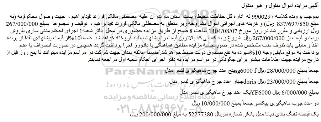 بموجب پرونده کلاسه 9900297 له  اداره کل حفاظت محیط زیست استان مازندران علیه  مصطفی مالکی فرزند محمدابراهیم ،  جهت وصول محکومُ به (به مبلغ 837/697/850  ریال) و هزینه های اجرائی اموال مشروحه زیر متعلق به مصطفی مالکی فرزند محمدابراهیم ،  توقیف و مجموعا  بمبلغ 267/000/000 ریال ارزیابی و مقرر شد در روز مورخ 1404/08/07 ساعت 8 صبح از طریق مزایده حضوری در محل  دفتر شعبه1 اجرای احکام مدنی ساری بفروش برسد و قیمت از 267/000/000 ریال  شروع و به کسانی که بالاترین قیمت را پیشنهاد نمایند فروخته خواهد شد  ضمناَ10%از قیمت پیشنهادی نقداَ از برنده اخذ و مابقی باید ظرف مدت مشخص شده در صورتجلسه مزایده مطابق هماهنگی با دادورز اجرا پرداخت گردد همچنین در صورت انصراف یا عدم پرداخت به موقع مابقی وجه 10%سپرده به نفع صندوق دولت ضبط خواهد شد./ضمنا علاقه مندان جهت شرکت در مراسم مزایده میتوانند تا پنج روز قبل از تاریخ مزایده جهت اطلاعات بیشتر برای چگونگی در مراسم مزایده به دفتر اجرای احکام شعبه اول مراجعه نمایند.