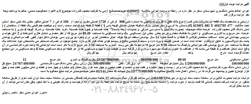اجرای احکام مدنی دادگستری شهرستان سقز در نظر دارد در رابطه با پرونده اجرائی بکلاسه  0400652دعویمحمدصالح آرمی به طرفیت محمود قادرزاده موضوع لازم الاجرا: محکومیت مدنی- حکم به پرداخت وجه نقد  مزایده برگزار کند