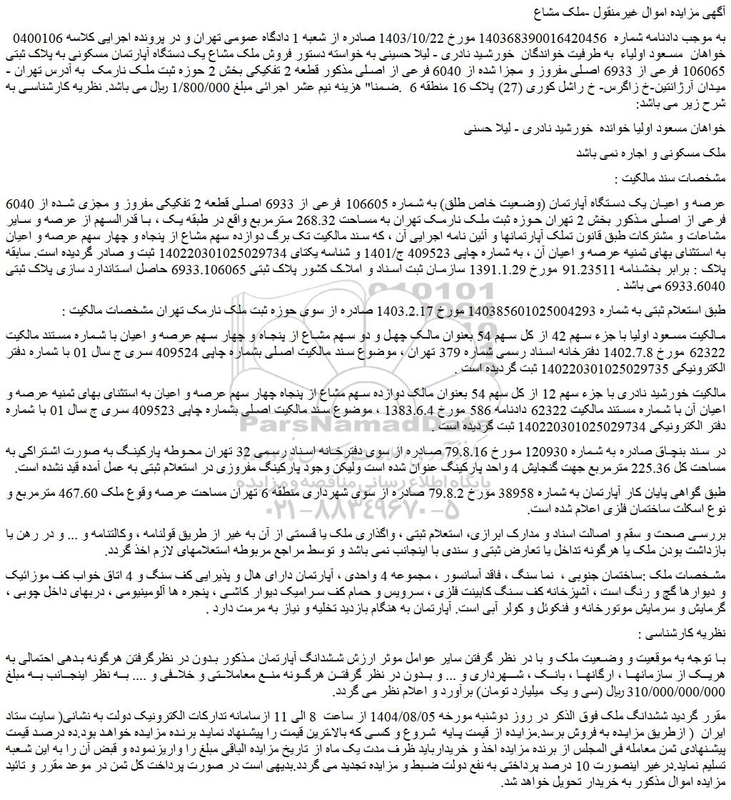 به موجب دادنامه شماره 140368390016420456 مورخ 1403/10/22 صادره از شعبه 1 دادگاه عمومی تهران و در پرونده اجرایی کلاسه 0400106 خواهان مسعود اولیاء به طرفیت خواندگان خورشید نادری - لیلا حسینی به خواسته دستور فروش ملک مشاع یک دستگاه آپارتمان مسکونی به پلاک ثبتی 106065 فرعی از 6933 اصلی مفروز و مجزا شده از 6040 فرعی از اصلی مذکور قطعه 2 تفکیکی بخش 2 حوزه ثبت ملک نارمک به آدرس تهران -میدان آرژانتین-خ زاگرس- خ راشل کوری (27) پلاک 16 منطقه 6 .ضمنا" هزینه نیم عشر اجرائی مبلغ 1/800/000 ریال می باشد. نظریه کارشناسی به شرح زیر می باشد: