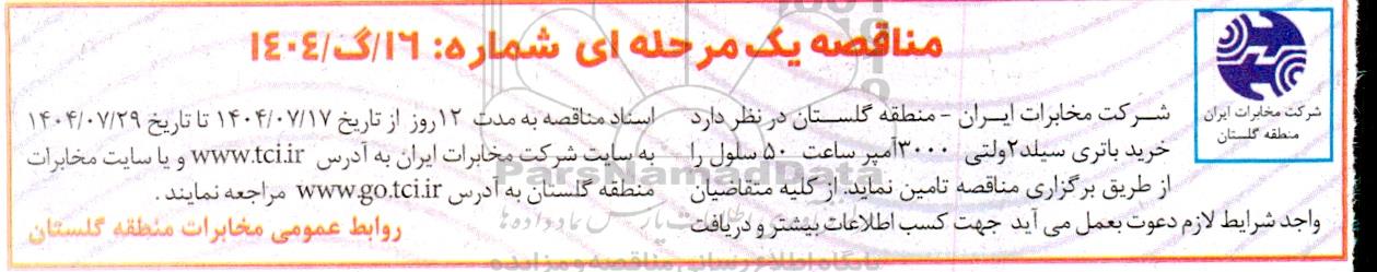 شرکت مخابرات ایران - منطقه گلستان در نظر دارد خرید باتری سیلد 2ولتی 3000 آمپرساعت 50 سلول را از طریق برگزاری مناقصه تامین نماید. از کلیه متقاضیان واجد شرایط لازم دعوت بعمل می آید جهت کسب اطلاعات بیشتر و دریافت