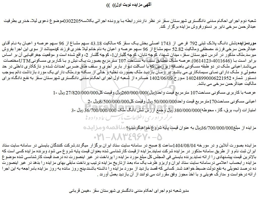 موردمزایده:شش دانگ پلاک ثبتی 792 فرعی از 1743 اصلی بخش یک سقز که مالکیت 43.18 سهم مشاع از 96 سهم عرصه و اعیان به نام آقای عبدالرحمن سرخی فرزند مصطفی ومالکیت 52.82 سهم مشاع از 96 سهم عرصه و اعیان به نام خانم لیلا خدری فرزند محمدمیباشد از سوی این اجرا بفروش میرسد.ملک مذکور در آدرس شهرستان سقز، میدان شهدا، کوچه تابان، کوچه گلباران1، کوچه گلنار 2، واقع شده است و موقعیت جغرافیایی آن بر اساس مختصات utm برابر است با (0614123،4011646).عرصه ملک مطابق سند، به مساحت 107 مترمربع بصورت یک نبش و با کاربری مسکونی می باشد.اعیانی ملک در دو طبقه مسکونی باضافه زیرزمین که با اسکلت دیوار باربر آجری و سقف طاق ضربی احداث شده و نازککاری داخلی در حد معمولی و ملک دارای نمای سیمانکاری می باشد. در زمان بازدید ملک بصورت تخلیه و خالی از سکنه بود.ملک دارای یک مورد بازداشت دائم بموجب دستور شماره 140248990006221952 مورخ 1402/06/09 صادره از شعبه اول اجرای احکام مدنی دادگستری شهرستان سقز به نفع دادگاه برای مالکیت عبدالرحمن سرخی می باشد.