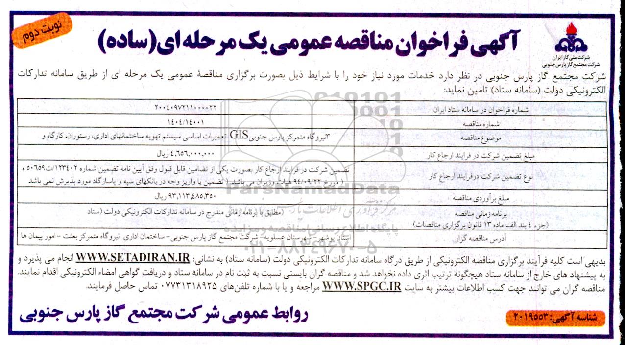 شرکت مجتمع گاز پارس جنوبی در نظر دارد خدمات مورد نیاز خود را با شرایط ذیل بصورت برگزاری مناقصه عمومی یک مرحله ای از طریق سامانه تدارکات الکترونیکی دولت سامانه ستاد تامین نماید