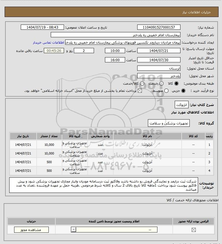 | 4 | -- | آنژیوکت | عدد | تجهیزات پزشکی و سلامت | 500 | 1404/07/21 |