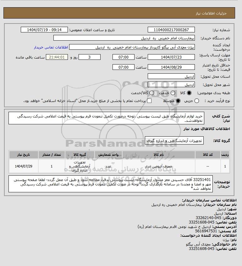استعلام بها و موضوع استعلام استعلام خرید لوازم آزمایشگاه طبق لیست پیوستی ،توجه درصورت تکمیل ننمودن فرم پیوستی به قیمت اعلامی شرکت رسیدگی نخواهدشد. به اطلاع کلیه شرکتها و افراد متخصص واجد شرایط میرساند، آگهی گذار در نظر دارد از طریق استعلام بها، نسبت به انتخاب و دریافت پیشنهادات اقدام نماید. این استعلام با کد آگهی ثبت شده در سامانه خبرگزاری پارس نماد : 9675426 منتشر شده است. مشخصات استعلام : تاریخ شروع استعلام: 1404/07/19 آخرین مهلت ارسال پیشنهاد قیمت : 1404/07/23 و محل اجرای پروژه : استان اردبیل میباشد. استعلام قیمت مورد درخواست : استعلام خرید لوازم آزمایشگاه طبق لیست پیوستی ،توجه درصورت تکمیل ننمودن فرم پیوستی به قیمت اعلامی شرکت رسیدگی نخواهدشد. با دستهبندیهای تخصصی و گروه های مرتبط : خدمات و تجهیزات آزمایشگاهی و پزشکی, استعلام اطلاع رسانی میگردد.