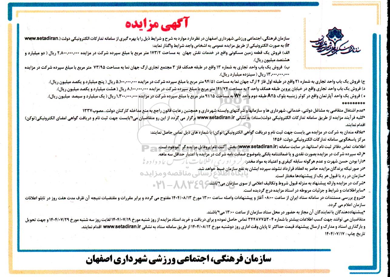 (ج) فروش یک باب واحد تجاری به شماره 21 واقع در طبقه اول فاز 4 ارگ جهان نما به مساحت 94.51 متر مربع با مبلغ سپرده شرکت در مزایده 5.100.000.000 ریال ( پنج میلیارد و یکصد میلیون ریال)