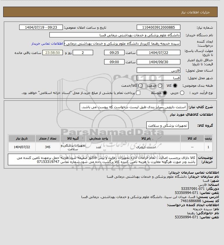 دانلود اسناد مناقصهاستعلام بها و موضوع استعلام استعلام استنت دارویی .سایز بندی طبق لیست درخواست که پیوست می باشد. به اطلاع کلیه شرکتها و افراد متخصص واجد شرایط میرساند، آگهی گذار در نظر دارد از طریق استعلام بها، نسبت به انتخاب و دریافت پیشنهادات اقدام نماید. این استعلام با کد آگهی ثبت شده در سامانه خبرگزاری پارس نماد : 9675599 منتشر شده است. مشخصات استعلام : تاریخ شروع استعلام: 1404/07/19 آخرین مهلت ارسال پیشنهاد قیمت : 1404/07/22 و محل اجرای پروژه : استان فارس میباشد. استعلام قیمت مورد درخواست : استعلام استنت دارویی .سایز بندی طبق لیست درخواست که پیوست می باشد. با دستهبندیهای تخصصی و گروه های مرتبط : خدمات و تجهیزات آزمایشگاهی و پزشکی, استعلام اطلاع رسانی میگردد. شرایط شرکت در استعلام آنلاین : ابتدا ثبت نام در سامانه استعلام پارس نماد و تکمیل مدارک موردنیاز و بارگذاری در سامانه رعایت تمامی ضوابط و الزامات مندرج در اسناد استعلام است.