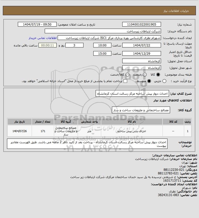 شرح کلی نیاز: احداث دیوار پیش ساخته مرکز رسالت استان کرمانشاه