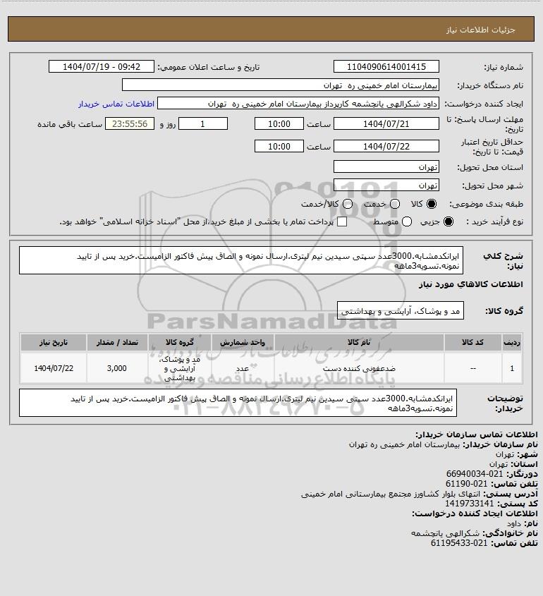 شرح کلی نیاز: ایرانکدمشابه.3000عدد سپتی سیدین نیم لیتری.ارسال نمونه و الصاق پیش فاکتور الزامیست.خرید پس از تایید نمونه.تسویه3ماهه