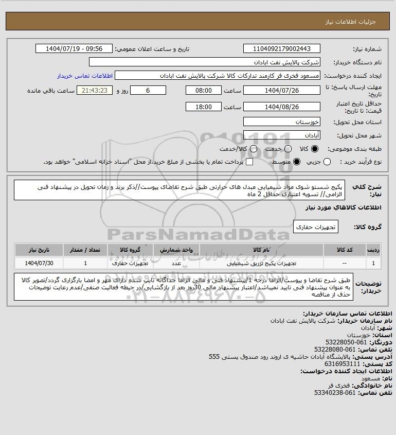 استعلام بها و موضوع استعلام استعلام پکیج شستو شوی مواد شیمیایی مبدل های حرارتی طبق شرح تقاضای پیوست//ذکر برند و زمان تحویل در پیشنهاد فنی الزامی// تسویه اعتباری حداقل 2 ماه به اطلاع کلیه شرکتها و افراد متخصص واجد شرایط میرساند، آگهی گذار در نظر دارد از طریق استعلام بها، نسبت به انتخاب و دریافت پیشنهادات اقدام نماید. این استعلام با کد آگهی ثبت شده در سامانه خبرگزاری پارس نماد : 9676115 منتشر شده است. مشخصات استعلام : تاریخ شروع استعلام: 1404/07/19 آخرین مهلت ارسال پیشنهاد قیمت : 1404/07/26 و محل اجرای پروژه : استان خوزستان میباشد. استعلام قیمت مورد درخواست : استعلام پکیج شستو شوی مواد شیمیایی مبدل های حرارتی طبق شرح تقاضای پیوست//ذکر برند و زمان تحویل در پیشنهاد فنی الزامی// تسویه اعتباری حداقل 2 ماه با دستهبندیهای تخصصی و گروه های مرتبط : صنایع حرارتی و برودتی, مواد شیمیایی, برج های تقطیر،مخازن تحت فشار و مبدل های حرارتی, تجهیزات نفت و گاز, مواد اولیه کارخانجات, استعلام اطلاع رسانی میگردد.
