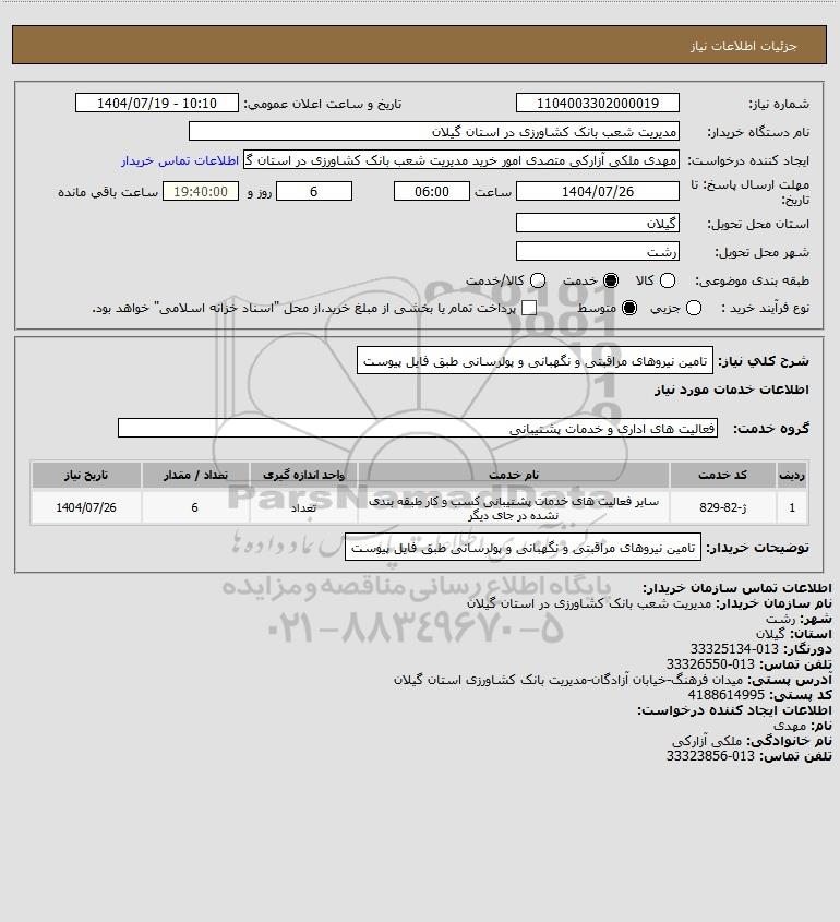 شرح کلی نیاز: تامین نیروهای مراقبتی و نگهبانی و پولرسانی طبق فایل پیوست