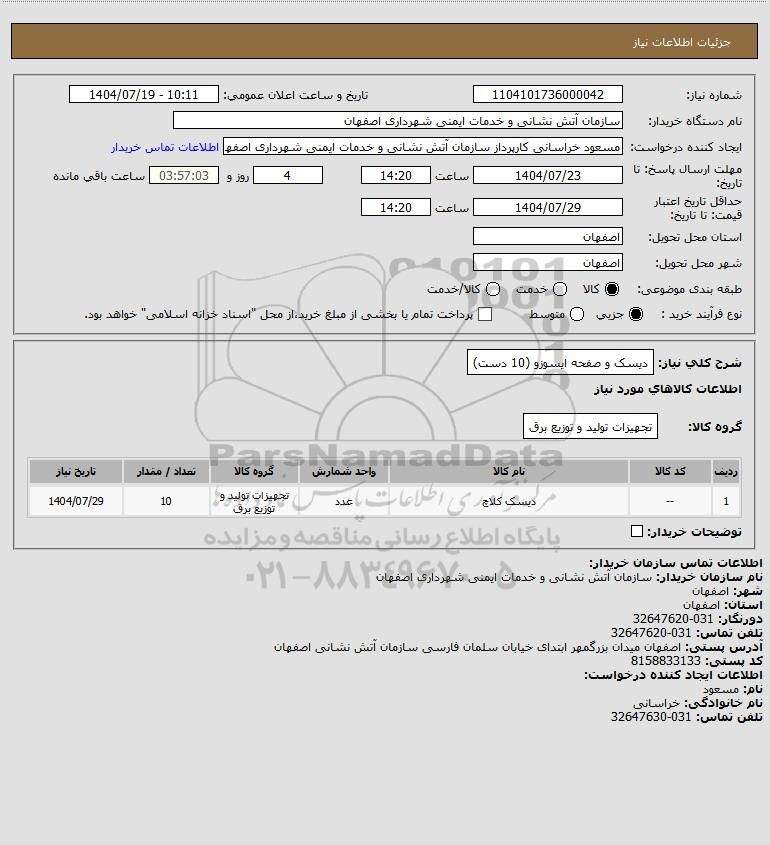 شرح کلی نیاز: دیسک و صفحه ایسوزو (10 دست)