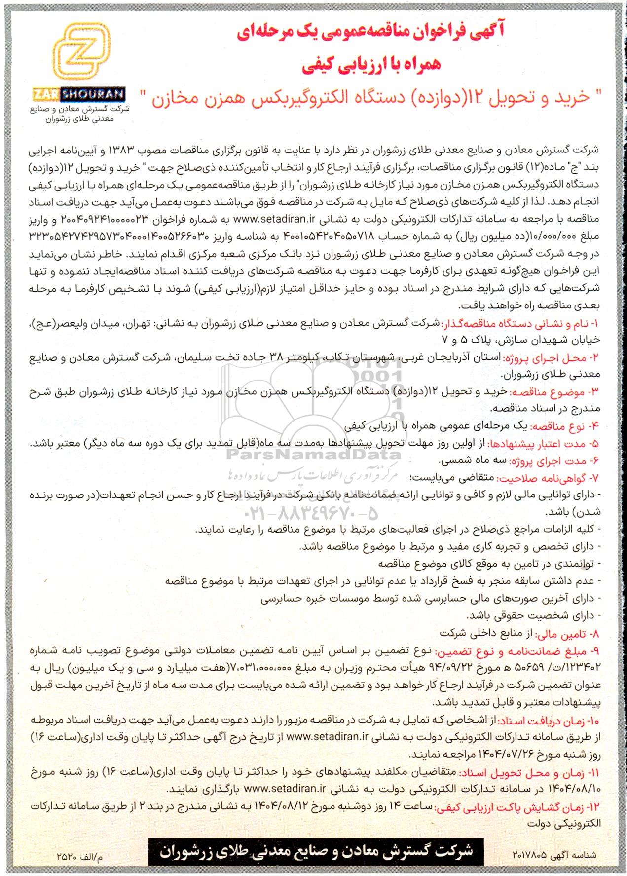 شرکت گسترش معادن و صنایع معدنی طلای زرشوران در نظر دارد با عنایت به قانون برگزاری مناقصات مصوب 1383 و آیین نامه اجرایی بند "ج" ماده (12) قانون برگزاری مناقصات برگزاری فرآیند ارجاع کار و انتخاب تأمین کننده ذی صلاح جهت خرید و تحویل (12 دوازدهدستگاه الکتروگیربکس همزن مخازن مورد نیاز کارخانه طلای زرشوران را از طریق مناقصه عمومی یک مرحله ای همراه با ارزیابی کیفی انجام دهد. لذا از کلیه شرکتهای ذی صلاح که مایل به شرکت در مناقصه فوق میباشند دعوت به عمل می آید جهت دریافت اسناد مناقصه با مراجعه به سامانه تدارکات الکترونیکی دولت به نشانی (ستاد ایران) به شماره فراخوان 2004092410000023 و واریز مبلغ 10.000.000 ده میلیون ریال به شماره حساب 4001054204050718 به شناسه واریز 323054274295730400014005266030 در وجه شرکت گسترش معادن و صنایع معدنی طلای زرشوران نزد بانک مرکزی شعبه مرکزی اقدام نمایند خاطر نشان مینماید این فراخوان هیچ گونه تعهدی برای کارفرما جهت دعوت به مناقصه شرکتهای دریافت کننده اسناد مناقصه ایجاد ننموده و تنها شرکتهایی که دارای شرایط مندرج در اسناد بوده و حایز حداقل امتیاز لازم ارزیابی کیفی شوند با تشخیص کارفرما به مرحله بعدی مناقصه راه خواهند یافت.