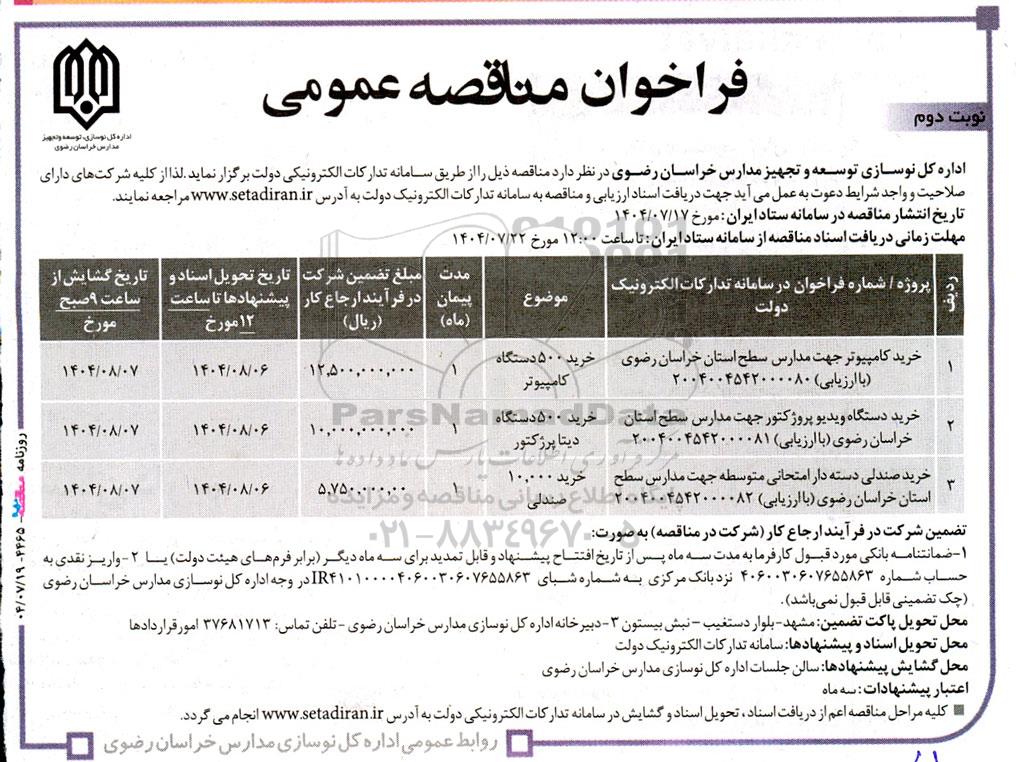 | 1 | خرید کامپیوتر جهت مدارس سطح استان خراسان رضوی (با ارزیابی) 2004004542000080 | خرید 500 دستگاه کامپیوتر | 1 | 12.500.000.000 |