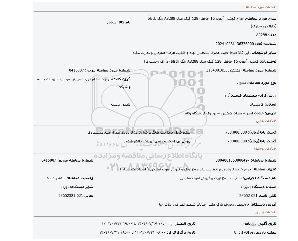 مزایده عمومی مزایده گوشی آیفون 16 حافظه 128 گیک مدل A3288 رنگ black (دارای رجستری) برگزار میگردد. از کلیه افراد متخصص و شرکتهای واجد شرایط دعوت به عمل میآید تا در این مزایده با کد خبرگزاری پارس نماد : 9676546 شرکت نمایند تاریخ شروع مزایده : 1404/07/19 مهلت شرکت در مزایده: تا پایان روز 1404/07/21