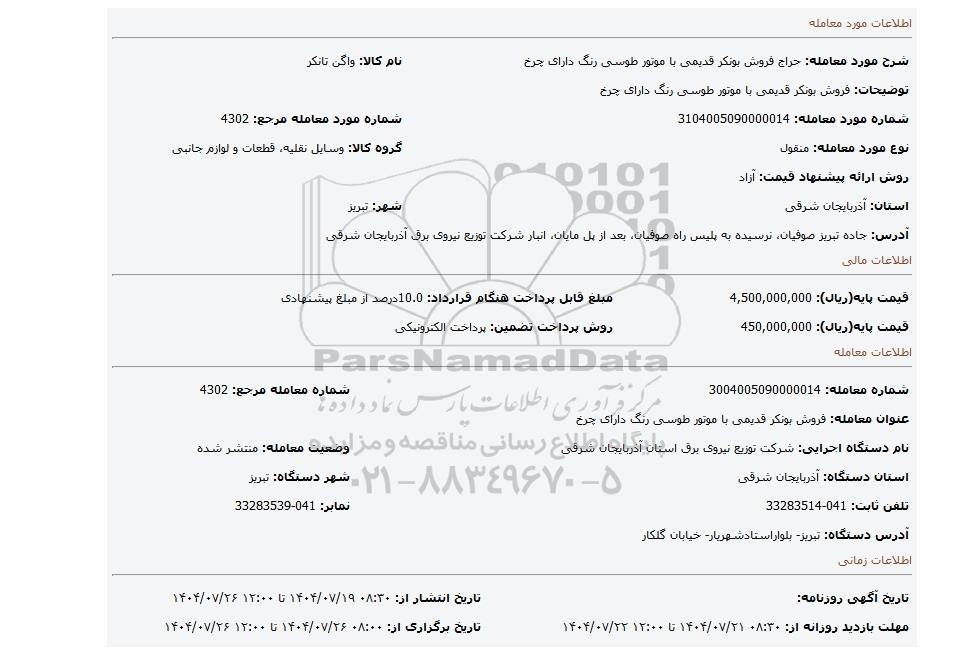 | شماره مورد معامله: 3104005090000014 | شماره مورد معامله مرجع: 4302 | |