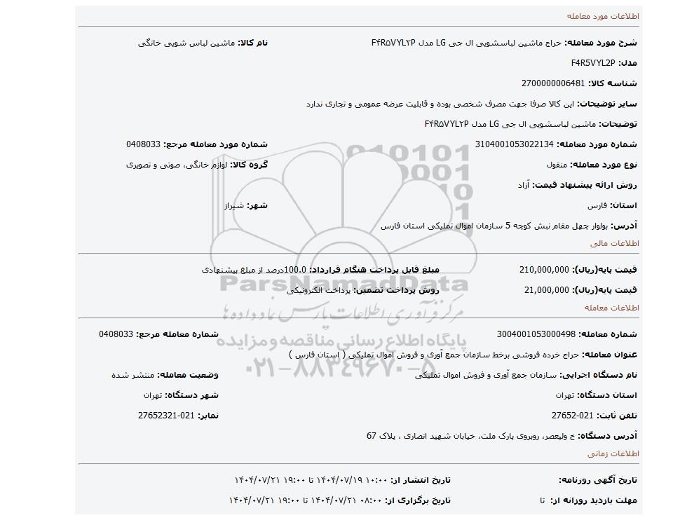 مزایده عمومی مزایده ماشین لباسشویی ال جی LG مدل F۴R۵VYL۲P برگزار میگردد. از کلیه افراد متخصص و شرکتهای واجد شرایط دعوت به عمل میآید تا در این مزایده با کد خبرگزاری پارس نماد : 9676575 شرکت نمایند تاریخ شروع مزایده : 1404/07/19 مهلت شرکت در مزایده: تا پایان روز 1404/07/21 مکان برگزاری اموال واگذاری استانهای فارس و دستهبندیهای مربوط به این حراجی متفرقه میباشد.