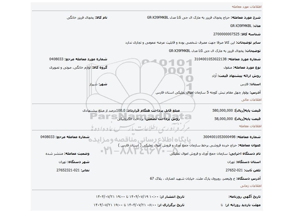 عنوان معامله: حراج خرده فروشی برخط سازمان جمع آوری و فروش اموال تملیکی ( استان فارس )