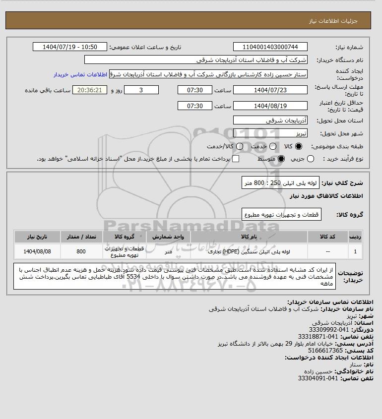 شرح کلی نیاز: لوله پلی اتیلن 250 : 800 متر