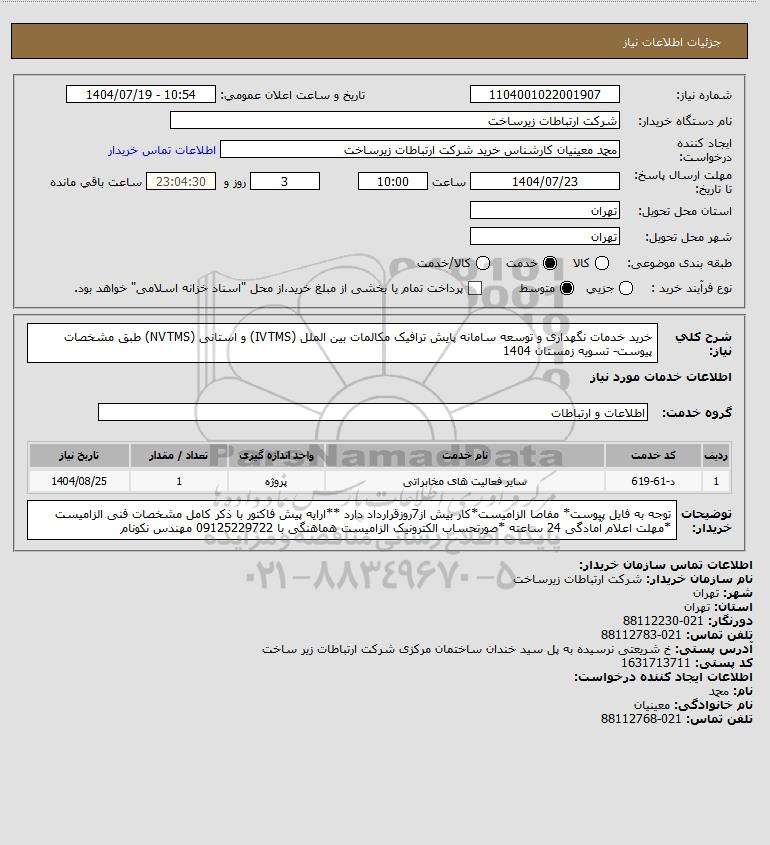 شرح کلی نیاز: خرید خدمات نگهداری و توسعه سامانه پایش ترافیک مکالمات بین الملل (IVTMS) و استانی (NVTMS) طبق مشخصات پیوست- تسویه زمستان 1404